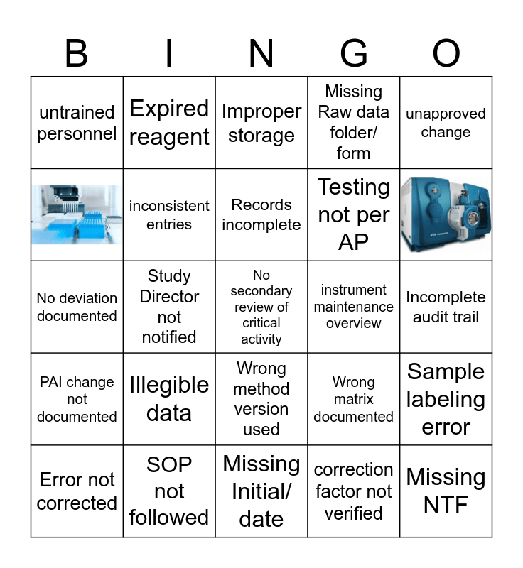 This bingo card has 2 images and 23 words: Illegible data, Missing Initial/ date, Records incomplete, Error not corrected, unapproved change, untrained personnel, Expired reagent, instrument maintenance overview, Wrong method version used, Testing not per AP, No deviation documented, Wrong matrix documented, Sample labeling error, inconsistent entries, Missing NTF, Incomplete audit trail, Improper storage, Study Director not notified, No secondary review of critical activity, SOP not followed, PAI change not documented, Missing Raw data folder/ form and correction factor not verified.