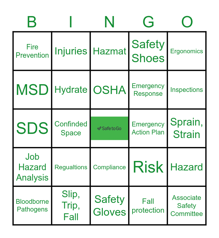This bingo card has a free space and 50 words: Safety, Associate Safety Committee, Hi-Vis Vest, Safety Gloves, Regualtions, First Aid, Injuries, Near Miss, MSD, WorkingWell, Hydrate, Safety Shoes, Hazard, Risk, Accident, PPE, OSHA, Emergency Action Plan, Rally Point, Ergonomics, Confinded Space, Fall protection, Fire Prevention, Emergency Response, Safety Training, Audit, Inspections, Austin, Hazmat, Compliance, Machine Safety, Hot Work, Emergency Eyewash, Flashlight, Slip, Trip, Fall, Struck by, Hard Hats, Incident Rate, Hazard Communication, Sprain, Strain, Active Stretching, Static Stretching, CPR, AED, Bloodborne Pathogens, SDS, Machine Guarding, Workplace Health and Safety, Job Hazard Analysis and Incident Investigation.