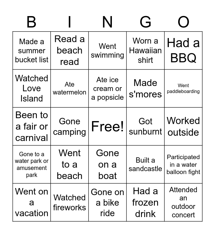 This bingo card has a free space and 24 words: Went to a beach, Watched fireworks, Ate ice cream or a popsicle, Went on a vacation, Had a BBQ, Made a summer bucket list, Watched Love Island, Read a beach read, Got sunburnt, Gone on a boat, Made s'mores, Been to a fair or carnival, Built a sandcastle, Participated in a water balloon fight, Ate watermelon, Had a frozen drink, Worked outside, Went swimming, Went paddleboarding, Gone camping, Attended an outdoor concert, Gone to a water park or amusement park, Worn a Hawaiian shirt and Gone on a bike ride.