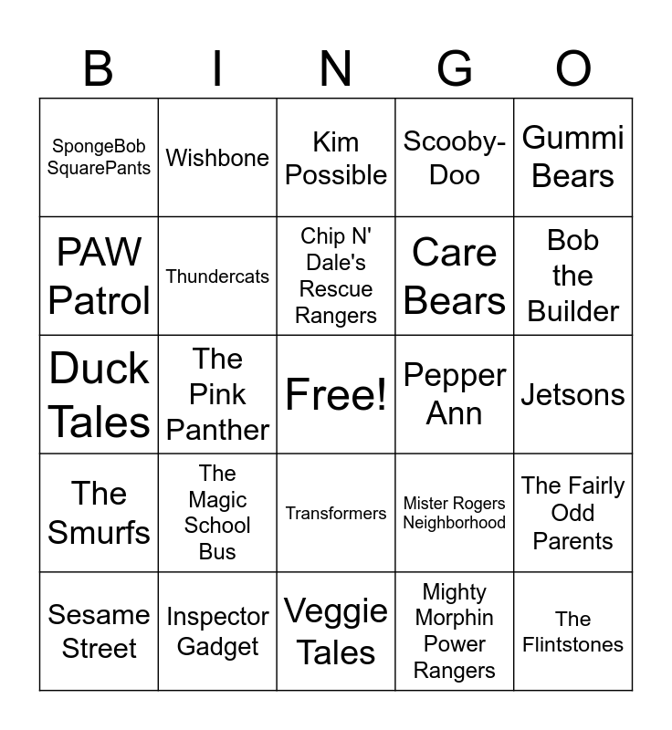 This bingo card has a free space and 41 words: Teenage Mutant Ninja Turtles, Duck Tales, Phineas and Ferb, Thundercats, Inspector Gadget, Transformers, Chip N' Dale's Rescue Rangers, Jem, Gummi Bears, The Smurfs, The Pink Panther, Scooby-Doo, The Flintstones, Jetsons, Pepper Ann, The Magic School Bus, The Proud Family, SpongeBob SquarePants, Bluey, Kim Possible, The Fairly Odd Parents, Arthur, Veggie Tales, Care Bears, Little Einsteins, Pinky and the Brain, Mighty Morphin Power Rangers, Powerpuff Girls, Bob the Builder, Animaniacs, Ren and Stimpy, Wishbone, Sesame Street, Splash and Bubbles, Mister Rogers Neighborhood, PAW Patrol, Looney Tunes, Darkwing Duck, Reading Rainbow, Muppet Babies and Mickey Mouse Clubhouse.