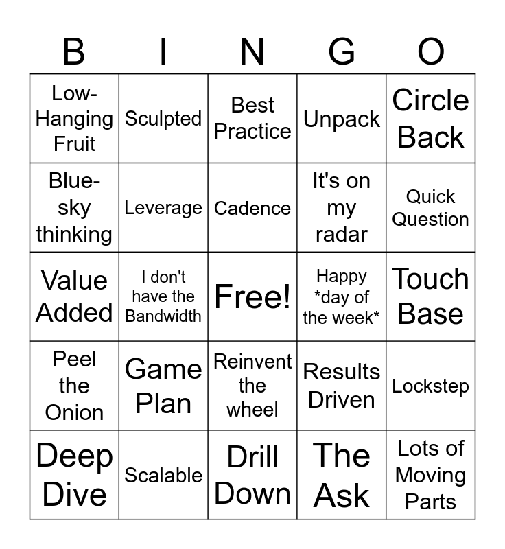 This bingo card has a free space and 29 words: Deep Dive, Hit the ground running, I don't have the Bandwidth, Action Item, Low-Hanging Fruit, Best Practice, Leverage, Game Plan, Happy *day of the week*, Scalable, Touch Base, Lots of Moving Parts, Drill Down, The Ask, Quick Question, It is what it is, Reinvent the wheel, Peel the Onion, Circle Back, Value Added, Results Driven, Drink the Kool-Aid, It's on my radar, Blue-sky thinking, Unpack, Sculpted, Lockstep, Cadence and Expectations.