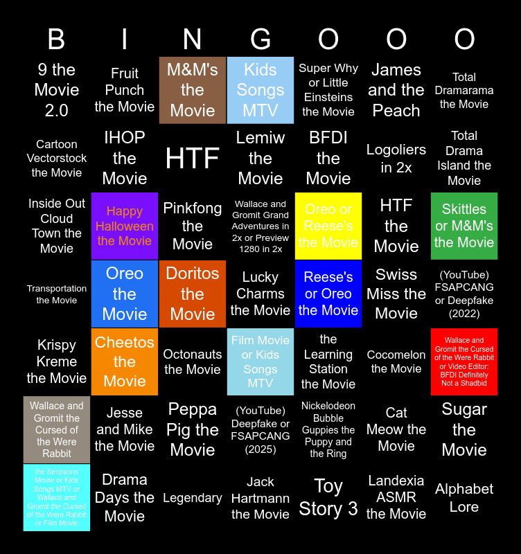 This bingo card has 112 words: Film Movie or Kids Songs MTV or Wallace and Gromit the Cursed of the Were Rabbit or the Simpsons Movie, Wallace and Gromit the Cursed of the Were Rabbit or the Simpsons Movie, Film Movie or Kids Songs MTV, Wallace and Gromit the Cursed of the Were Rabbit or the Simpsons Movie or Film Movie or Kids Songs MTV, Kids Songs MTV or the Simpsons Movie, the Simpsons Movie, Kids Songs MTV, the Simpsons Movie or Kids Songs MTV, Film Movie or Wallace and Gromit the Cursed of the Were Rabbit, Wallace and Gromit the Cursed of the Were Rabbit, Film Movie, Wallace and Gromit the Cursed of the Were Rabbit or Film Movie, Kids Songs MTV or the Simpsons Movie or Film Movie or Wallace and Gromit the Cursed of the Were Rabbit, the Simpsons Movie or Wallace and Gromit the Cursed of the Were Rabbit, Kids Songs MTV or Film Movie, the Simpsons Movie or Kids Songs MTV or Wallace and Gromit the Cursed of the Were Rabbit or Film Movie, Wallace and Gromit Grand Adventures in 2x or Preview 1280 in 2x, Preview 1280 in 2x, Wallace and Gromit Grand Adventures in 2x, Preview 1280 in 2x or Wallace and Gromit Grand Adventures in 2x, Skittles or M&M's the Movie, M&M's the Movie, Skittles the Movie, M&M'S or Skittles the Movie, Landexia ASMR the Movie, Happy Halloween the Movie, Transportation the Movie, the Learning Station the Movie, PJ Masks the Movie, Lego the Movie, 9 the Movie 2.0, BFDI the Movie, Lucky Charms the Movie, DVD the Movie, Cat Meow the Movie, (YouTube) FSAPCANG or Deepfake (2022), (YouTube) Deepfake (2023), (YouTube) FSAPCANG (2024), (YouTube) Deepfake or FSAPCANG (2025), Red Robin the Movie, Google Street See More Date the Movie, SMG4 the Movie, Peppa Pig the Movie, Pocoyo the Movie, Total Drama Island the Movie, Jimmy Kimmel Halloween Candy the Movie, Reese's or Oreo the Movie, Oreo the Movie, Reese's the Movie, Oreo or Reese's the Movie, Cheetos or Doritos the Movie, Doritos the Movie, Cheetos the Movie, Doritos or Cheetos the Movie, Numberblocks the Movie, Little Caeser's the Movie, Fruit Punch the Movie, Numa Cat the Movie, Cinnamon Toast Crunch the Movie, HTF the Movie, IHOP the Movie, Cinnabon the Movie, La Historia de Alfabeto the Movie, Video Editor: BFDI Definitely Not a Shadbid or Wallace and Gromit the Cursed of the Were Rabbit, Video Editor: BFDI Definitely Not a Shadbid, Wallace and Gromit the Cursed of the Were Rabbit or Video Editor: BFDI Definitely Not a Shadbid, TAWOG the Movie, Lemiw the Movie, Alphabet Lore, BFDI, Total Dramarama, HTF, Nickelodeon Bubble Guppies the Puppy and the Ring, Movie Logos the Movie, Bob the Train the Movie, Pinkfong the Movie, Octonauts the Movie, World of Movie Studios as Compilation by AI the Movie, Erica Cartman Big Pumpkin the Movie, Krispy Kreme the Movie, Logoliers in 2x, Sprunki the Movie, Cartoon Vectorstock the Movie, Total Dramarama the Movie, Cocomelon the Movie, Annoying Orange the Movie, Jack Hartmann the Movie, Goodnites the Movie, McDonald's Commercial Logo History, (YouTube) Title Nasir790, Kyle Istook the Movie, Super Why or Little Einsteins the Movie, Little Einsteins the Movie, Super Why the Movie, Little Einsteins or Super Why the Movie, Inside Out Cloud Town the Movie, Drama Days the Movie, Jesse and Mike the Movie, Kool-Aid the Movie, Merry Christmas the Movie, Steven Universe the Movie, Swiss Miss the Movie, Sugar the Movie, Crying Compilation, Fruit Loops the Movie, Toy Story 3, James and the Peach, Elemental, Coraline, Legendary, Inside Out and Lightyear.
