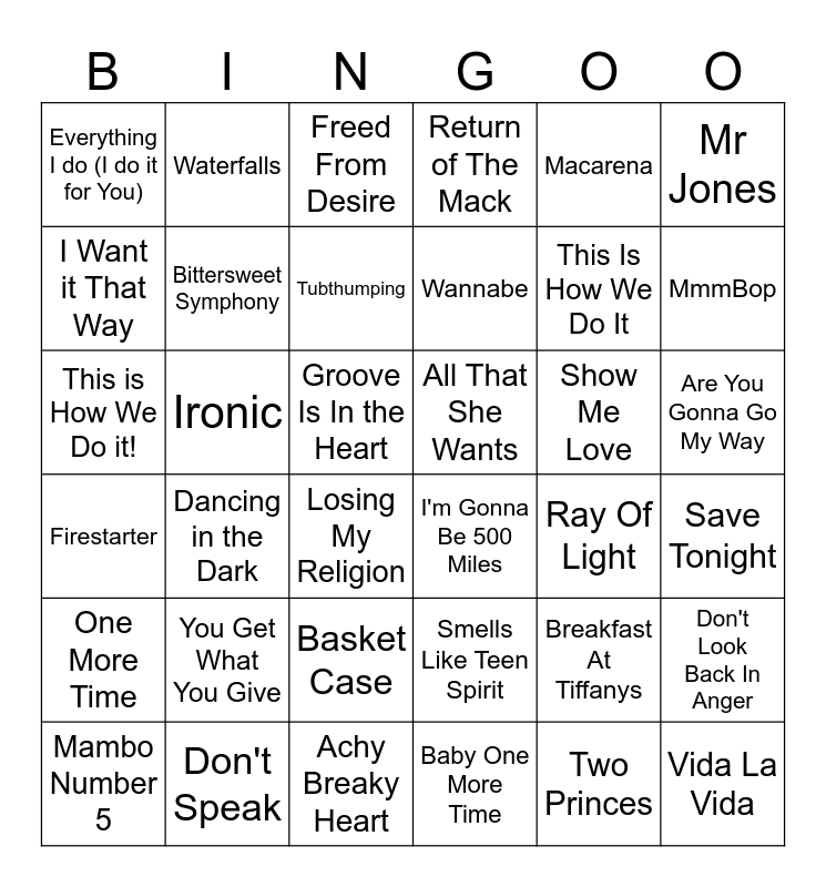 This bingo card has 36 words: Smells Like Teen Spirit, Basket Case, Baby One More Time, I Want it That Way, Firestarter, All That She Wants, Bittersweet Symphony, Achy Breaky Heart, Macarena, Breakfast At Tiffanys, MmmBop, Return of The Mack, Don't Look Back In Anger, Ironic, Wannabe, Everything I do (I do it for You), One More Time, Show Me Love, This is How We Do it!, Freed From Desire, Groove Is In the Heart, Dancing in the Dark, I'm Gonna Be 500 Miles, Losing My Religion, Ray Of Light, Waterfalls, This Is How We Do It, Don't Speak, Tubthumping, Mr Jones, Vida La Vida, Mambo Number 5, Save Tonight, Are You Gonna Go My Way, You Get What You Give and Two Princes.