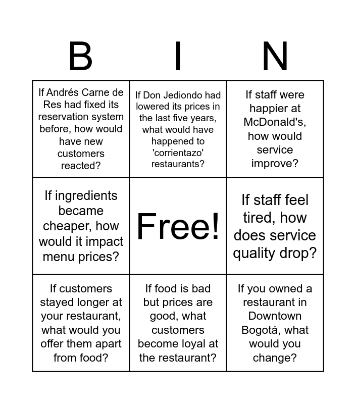 This bingo card has a free space and 10 words: If food is bad but prices are good, what customers become loyal at the restaurant?, If staff were happier at McDonald's, how would service improve?, If Andrés Carne de Res had fixed its reservation system before, how would have new customers reacted?, If you owned a restaurant in Downtown Bogotá, what would you change?, If ingredients became cheaper, how would it impact menu prices?, If customers stayed longer at your restaurant, what would you offer them apart from food?, If Don Jediondo had lowered its prices in the last five years, what would have happened to 'corrientazo' restaurants?, If a chef quits, why will the food change?, If staff feel tired, how does service quality drop? and If you ran a restaurant, how many dishes would you offer?.