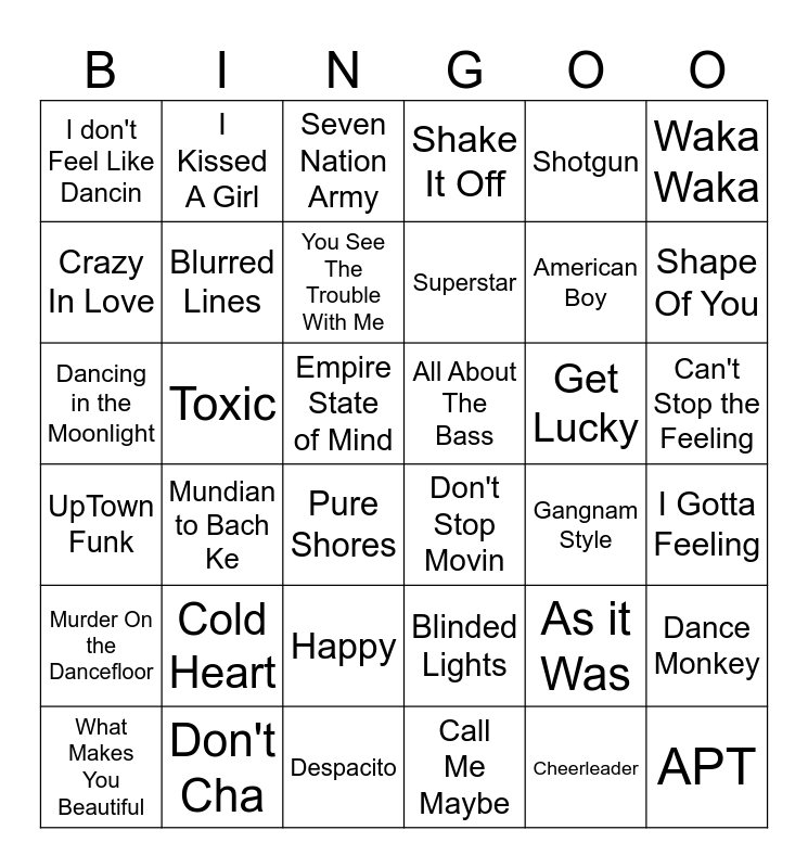 This bingo card has 36 words: Blinded Lights, Happy, Call Me Maybe, Crazy In Love, UpTown Funk, All About The Bass, Blurred Lines, Despacito, Shotgun, As it Was, Shape Of You, Shake It Off, Dance Monkey, Toxic, Superstar, I don't Feel Like Dancin, Murder On the Dancefloor, Get Lucky, Dancing in the Moonlight, Seven Nation Army, Empire State of Mind, Mundian to Bach Ke, Don't Stop Movin, Pure Shores, Gangnam Style, I Kissed A Girl, American Boy, Don't Cha, You See The Trouble With Me, Waka Waka, APT, What Makes You Beautiful, I Gotta Feeling, Can't Stop the Feeling, Cold Heart and Cheerleader.