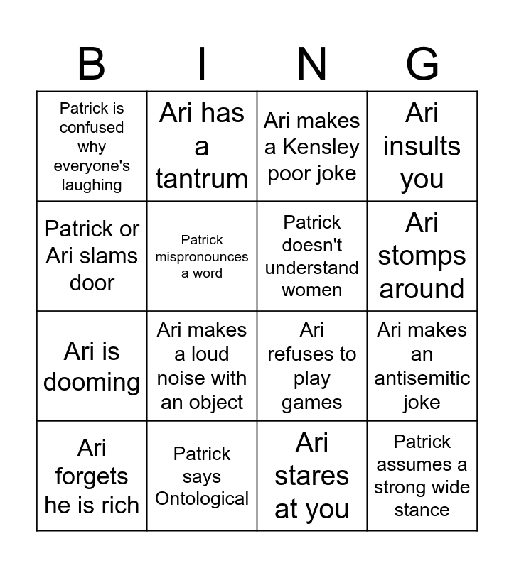 This bingo card has 16 words: Patrick says Ontological, Ari makes an antisemitic joke, Ari makes a Kensley poor joke, Patrick is confused why everyone's laughing, Ari is dooming, Ari has a tantrum, Ari refuses to play games, Ari stares at you, Patrick or Ari slams door, Patrick mispronounces a word, Ari forgets he is rich, Ari insults you, Ari makes a loud noise with an object, Ari stomps around, Patrick doesn't understand women and Patrick assumes a strong wide stance.