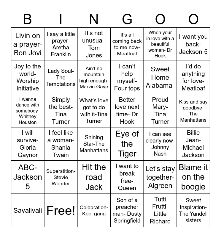 This bingo card has 39 words: Free!, Savalivali, This is the Day- Marantha Band, Joy to the world-Worship Initiative, Shining Star-The Manhattans, Kiss and say goodbye-The Manhattans, Lady Soul-The Temptations, Sweet Inspiration-The Yandell sisters, When your in love with a beautiful women- Dr Hook, Better love next time- Dr Hook, I’d do anything for love- Meatloaf, It’s all coming back to me now-Meatloaf, I wanna dance with somebody- Whitney Houston, What’s love got to do with it-Tina Turner, Simply the best-Tina Turner, Proud Mary- Tina Turner, Let’s stay together-Algreen, Livin on a prayer- Bon Jovi, Celebration- Kool gang, I will survive- Gloria Gaynor, I want you back- Jackson 5, I can see clearly now- Johnny Nash, Ain’t no mountain high enough-Marvin Gaye, I can’t help myself- Four tops, Son of a preacher man- Dusty Springfield, Hit the road Jack, ABC- Jackson 5, Tutti Frutti- Little Richard, Superstition-Stevie Wonder, I say a little prayer- Aretha Franklin, RESPECT- Aretha Franklin, Blame it on the boogie, It’s not unusual- Tom Jones, Eye of the Tiger, Billie Jean- Michael Jackson, I want to break free- Queen, I feel like a woman-Shania Twain, Sweet Home Alabama- and I got you ( I feel good) James Brown.