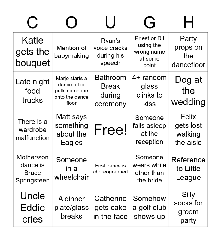 This bingo card has a free space and 29 words: Uncle Eddie cries, SHOUT! plays, Matt says something about the Eagles, Don’t Stop Believing plays, Katie gets the bouquet, Ryan’s voice cracks during his speech, Marje starts a dance off or pulls someone onto the dance floor, Someone in a wheelchair, Someone falls asleep at the reception, A dinner plate/glass breaks, Felix gets lost walking the aisle, Silly socks for groom party, Catherine gets cake in the face, Somehow a golf club shows up, Dog at the wedding, Aunt Terry is late to something, First dance is choreographed, Mother/son dance is Bruce Springsteen, Party props on the dancefloor, There is a wardrobe malfunction, Someone wears white other than the bride, Impromptu speech, 4+ random glass clinks to kiss, Late night food trucks, Priest or DJ using the wrong name at some point, Mention of babymaking, Reference to Little League, Bathroom Break during ceremony and Jim does a Zyn.