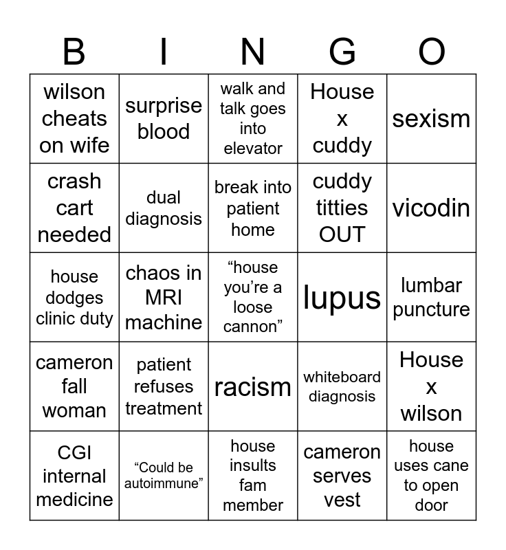 This bingo card has a free space and 24 words: patient refuses treatment, “Could be autoimmune”, break into patient home, CGI internal medicine, sexism, wilson cheats on wife, crash cart needed, surprise blood, lupus, racism, cuddy titties OUT, house dodges clinic duty, whiteboard diagnosis, House x wilson, dual diagnosis, cameron serves vest, lumbar puncture, walk and talk goes into elevator, vicodin, chaos in MRI machine, house uses cane to open door, cameron fall woman, House x cuddy and house insults fam member.