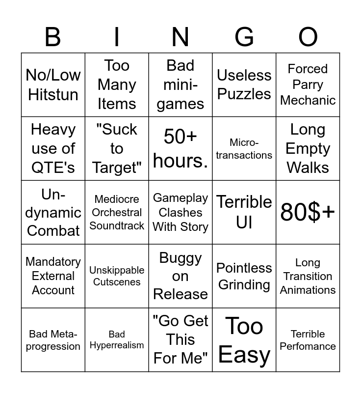 This bingo card has 25 words: Unskippable Cutscenes, "Go Get This For Me", 50+ hours., Bad Meta- progression, Forced Parry Mechanic, No/Low Hitstun, Heavy use of QTE's, Too Many Items, Terrible UI, Buggy on Release, Micro- transactions, Un-dynamic Combat, Pointless Grinding, Long Transition Animations, "Suck to Target", Terrible Perfomance, 80$+, Bad mini-games, Long Empty Walks, Mediocre Orchestral Soundtrack, Gameplay Clashes With Story, Bad Hyperrealism, Mandatory External Account, Useless Puzzles and Too Easy.