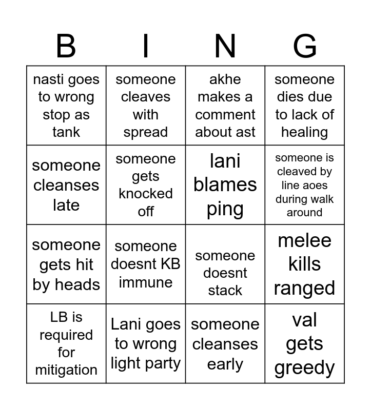 This bingo card has 16 words: Lani goes to wrong light party, melee kills ranged, akhe makes a comment about ast, nasti goes to wrong stop as tank, someone gets hit by heads, someone cleaves with spread, someone doesnt stack, someone cleanses early, someone cleanses late, someone gets knocked off, LB is required for mitigation, someone dies due to lack of healing, someone doesnt KB immune, someone is cleaved by line aoes during walk around, lani blames ping and val gets greedy.