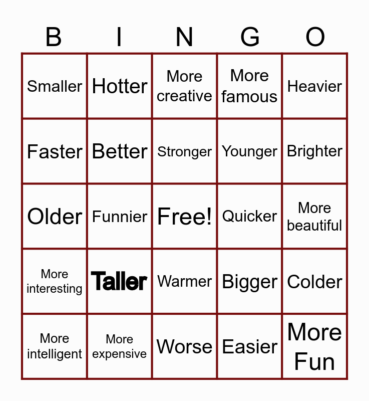 This bingo card has a free space and 24 words: Taller, More expensive, Stronger, More intelligent, Heavier, Smaller, Faster, Hotter, Quicker, Warmer, Younger, Older, Bigger, Colder, Better, Easier, More beautiful, More creative, Brighter, Funnier, More Fun, More interesting, More famous and Worse.