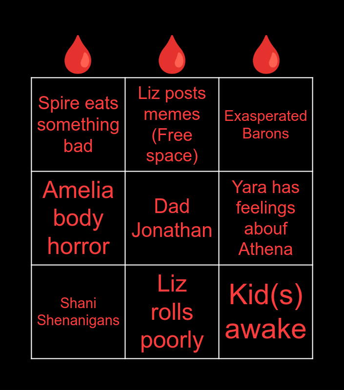 This bingo card has 9 words: Shani Shenanigans, Dad Jonathan, Exasperated Barons, Spire eats something bad, Liz posts memes (Free space), Yara has feelings abouf Athena, Amelia body horror, Liz rolls poorly and Kid(s) awake.