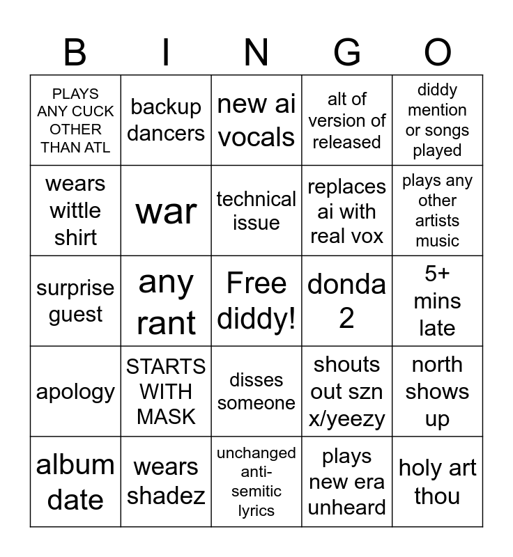 This bingo card has a free space and 24 words: STARTS WITH MASK, wears shadez, technical issue, album date, diddy mention or songs played, PLAYS ANY CUCK OTHER THAN ATL, wears wittle shirt, backup dancers, donda 2, disses someone, replaces ai with real vox, surprise guest, shouts out szn x/yeezy, north shows up, war, plays new era unheard, 5+ mins late, new ai vocals, plays any other artists music, any rant, holy art thou, apology, alt of version of released and unchanged anti-semitic lyrics.