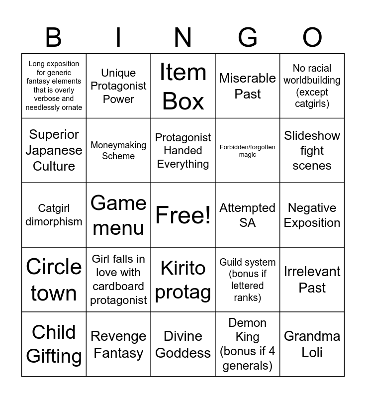 This bingo card has a free space and 29 words: Child Gifting, Child Arc, Game menu, Slavery, Long exposition for generic fantasy elements that is overly verbose and needlessly ornate, Item Box, Moneymaking Scheme, Girl falls in love with cardboard protagonist, Attempted SA, Revenge Fantasy, Negative Exposition, Grandma Loli, Divine Goddess, Demon King (bonus if 4 generals), Slideshow fight scenes, Born with powers, Kirito protag, Circle town, No racial worldbuilding (except catgirls), Catgirl dimorphism, Guild system (bonus if lettered ranks), Appraisal or support skills, Forbidden/forgotten magic, Superior Japanese Culture, Miserable Past, Unique Protagonist Power, Irrelevant Past, Protagonist Handed Everything and Harem.