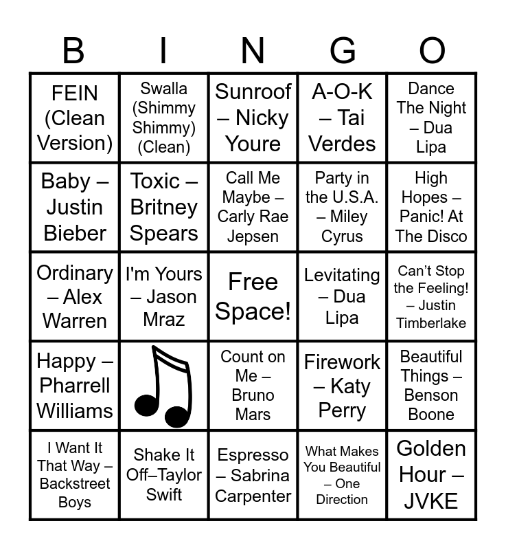 This bingo card has 1 images, a free space and 23 words: Shake It Off–Taylor Swift, Call Me Maybe – Carly Rae Jepsen, I Want It That Way – Backstreet Boys, Dance The Night – Dua Lipa, FEIN (Clean Version), Baby – Justin Bieber, Swalla (Shimmy Shimmy) (Clean), Levitating – Dua Lipa, Count on Me – Bruno Mars, Party in the U.S.A. – Miley Cyrus, Ordinary – Alex Warren, Firework – Katy Perry, Beautiful Things – Benson Boone, Toxic – Britney Spears, What Makes You Beautiful – One Direction, Can’t Stop the Feeling! – Justin Timberlake, Sunroof – Nicky Youre, High Hopes – Panic! At The Disco, I'm Yours – Jason Mraz, Golden Hour – JVKE, Happy – Pharrell Williams, A-O-K – Tai Verdes and Espresso – Sabrina Carpenter.