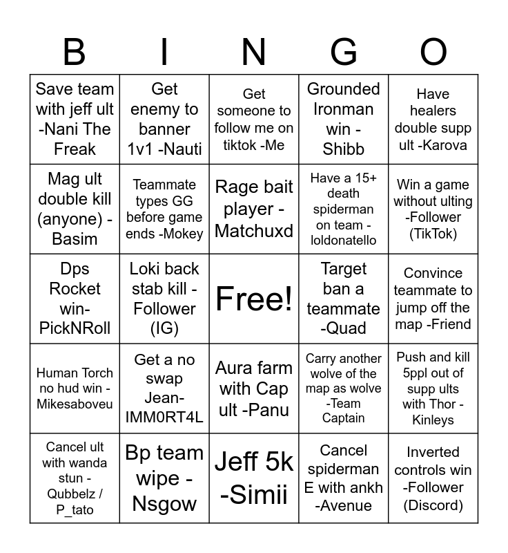 This bingo card has a free space and 24 words: Get a no swap Jean- IMM0RT4L, Bp team wipe -Nsgow, Rage bait player -Matchuxd, Cancel ult with wanda stun -Qubbelz / P_tato, Have healers double supp ult -Karova, Save team with jeff ult -Nani The Freak, Mag ult double kill (anyone) -Basim, Get enemy to banner 1v1 -Nauti, Target ban a teammate -Quad, Aura farm with Cap ult -Panu, Have a 15+ death spiderman on team -loldonatello, Dps Rocket win- PickNRoll, Carry another wolve of the map as wolve -Team Captain, Push and kill 5ppl out of supp ults with Thor -Kinleys, Teammate types GG before game ends -Mokey, Cancel spiderman E with ankh -Avenue, Convince teammate to jump off the map -Friend, Get someone to follow me on tiktok -Me, Win a game without ulting -Follower (TikTok), Loki back stab kill -Follower (IG), Inverted controls win -Follower (Discord), Human Torch no hud win -Mikesaboveu, Grounded Ironman win -Shibb and Jeff 5k -Simii.