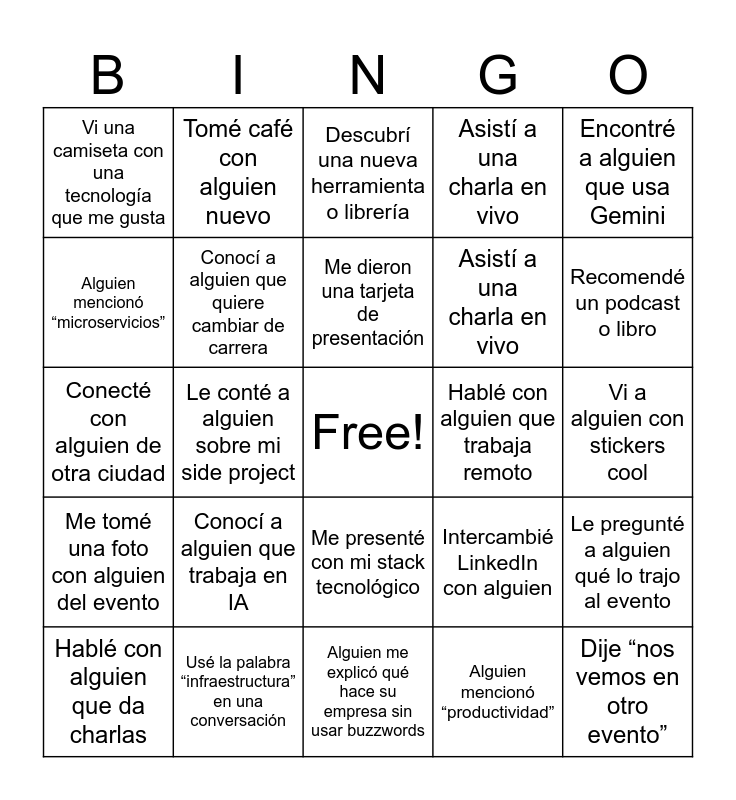 This bingo card has a free space and 24 words: Conocí a alguien que trabaja en IA, Usé la palabra “infraestructura” en una conversación, Me dieron una tarjeta de presentación, Hablé con alguien que da charlas, Encontré a alguien que usa Gemini, Vi una camiseta con una tecnología que me gusta, Alguien mencionó “microservicios”, Tomé café con alguien nuevo, Hablé con alguien que trabaja remoto, Me presenté con mi stack tecnológico, Asistí a una charla en vivo, Conecté con alguien de otra ciudad, Intercambié LinkedIn con alguien, Le pregunté a alguien qué lo trajo al evento, Conocí a alguien que quiere cambiar de carrera, Alguien mencionó “productividad”, Vi a alguien con stickers cool, Descubrí una nueva herramienta o librería, Recomendé un podcast o libro, Le conté a alguien sobre mi side project, Dije “nos vemos en otro evento”, Me tomé una foto con alguien del evento, Asistí a una charla en vivo and Alguien me explicó qué hace su empresa sin usar buzzwords.
