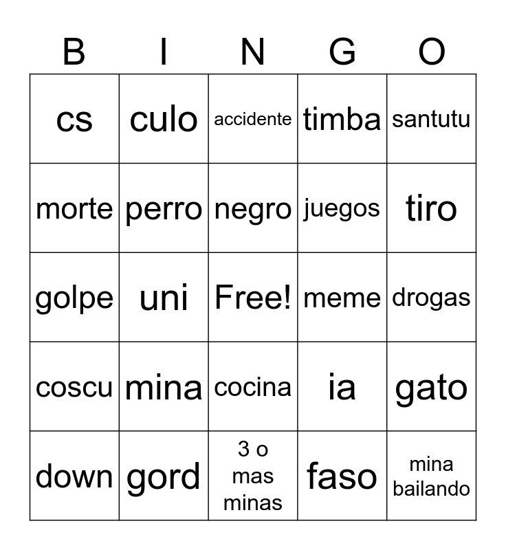 This bingo card has a free space and 24 words: mina, gord, negro, down, santutu, cs, morte, culo, meme, cocina, juegos, golpe, ia, gato, perro, faso, drogas, accidente, tiro, uni, mina bailando, coscu, timba and 3 o mas minas.