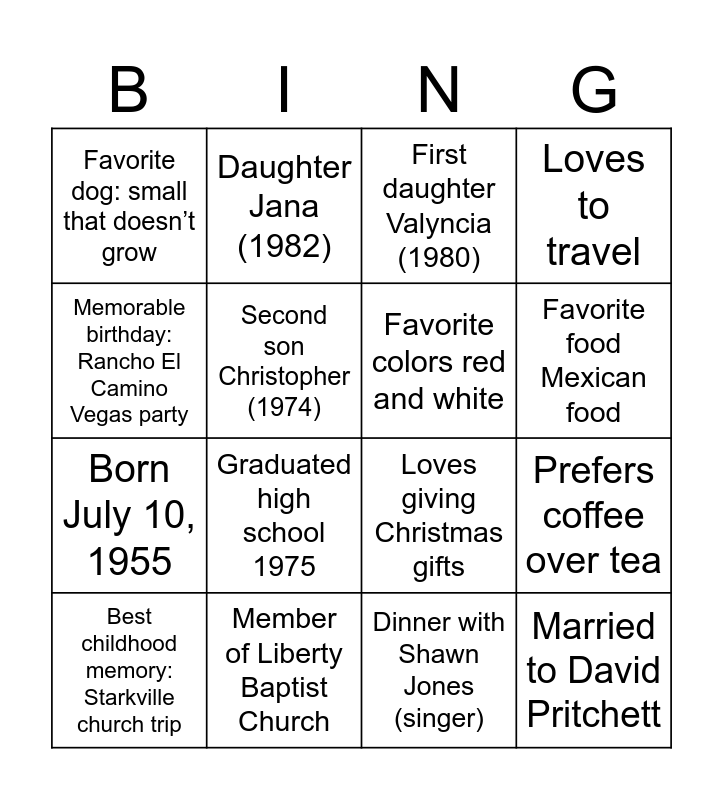 This bingo card has 27 words: Free!, Turning 70 this year, Born July 10, 1955, First son Realdo (1972), Second son Christopher (1974), First daughter Valyncia (1980), Daughter Jana (1982), Married to David Pritchett, Member of Liberty Baptist Church, Loves giving birthday gifts, Loves giving Christmas gifts, Loves to travel, Attended Carver Middle School, Attended Sidney Lanier High School, Graduated high school 1975, Favorite song: "Nearer My God To Thee", Favorite colors red and white, Favorite food Mexican food, Favorite movie "Coming to America", Favorite dog: small that doesn’t grow, Dinner with Shawn Jones (singer), Favorite season Summer, Prefers coffee over tea, Best childhood memory: Starkville church trip, Coolest travel place: St. Thomas, Memorable birthday: Rancho El Camino Vegas party and Influential person: Mary Winston (Pat).