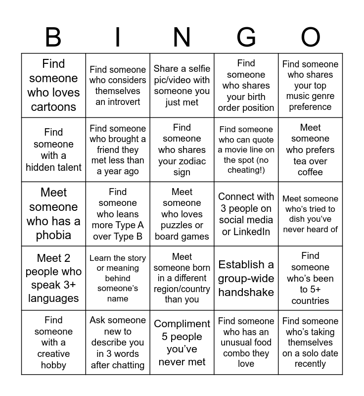 This bingo card has 25 words: Learn the story or meaning behind someone’s name, Compliment 5 people you’ve never met, Find someone who shares your zodiac sign, Find someone with a creative hobby, Find someone who shares your top music genre preference, Find someone who loves cartoons, Find someone with a hidden talent, Find someone who considers themselves an introvert, Connect with 3 people on social media or LinkedIn, Meet someone born in a different region/country than you, Find someone who can quote a movie line on the spot (no cheating!), Meet someone who has a phobia, Establish a group-wide handshake, Find someone who’s been to 5+ countries, Find someone who brought a friend they met less than a year ago, Find someone who’s taking themselves on a solo date recently, Meet someone who’s tried to dish you’ve never heard of, Share a selfie pic/video with someone you just met, Meet someone who prefers tea over coffee, Find someone who leans more Type A over Type B, Meet someone who loves puzzles or board games, Ask someone new to describe you in 3 words after chatting, Meet 2 people who speak 3+ languages, Find someone who shares your birth order position and Find someone who has an unusual food combo they love.