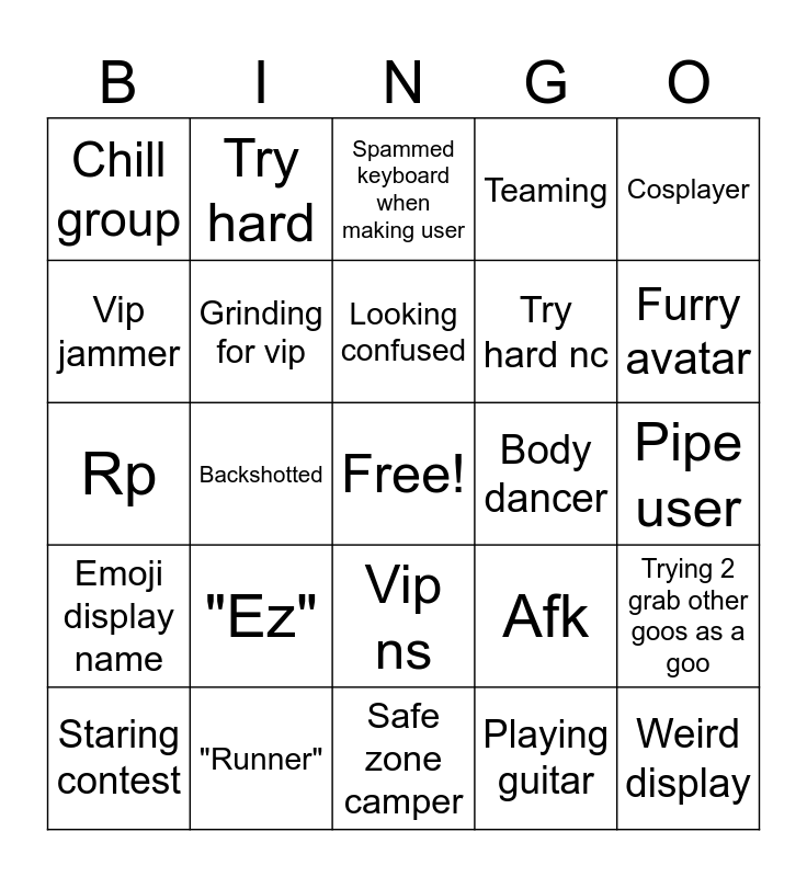 This bingo card has a free space and 24 words: "Ez", "Runner", Looking confused, Staring contest, Cosplayer, Chill group, Vip jammer, Try hard, Body dancer, Vip ns, Try hard nc, Rp, Afk, Trying 2 grab other goos as a goo, Grinding for vip, Playing guitar, Pipe user, Spammed keyboard when making user, Furry avatar, Backshotted, Weird display, Emoji display name, Teaming and Safe zone camper.