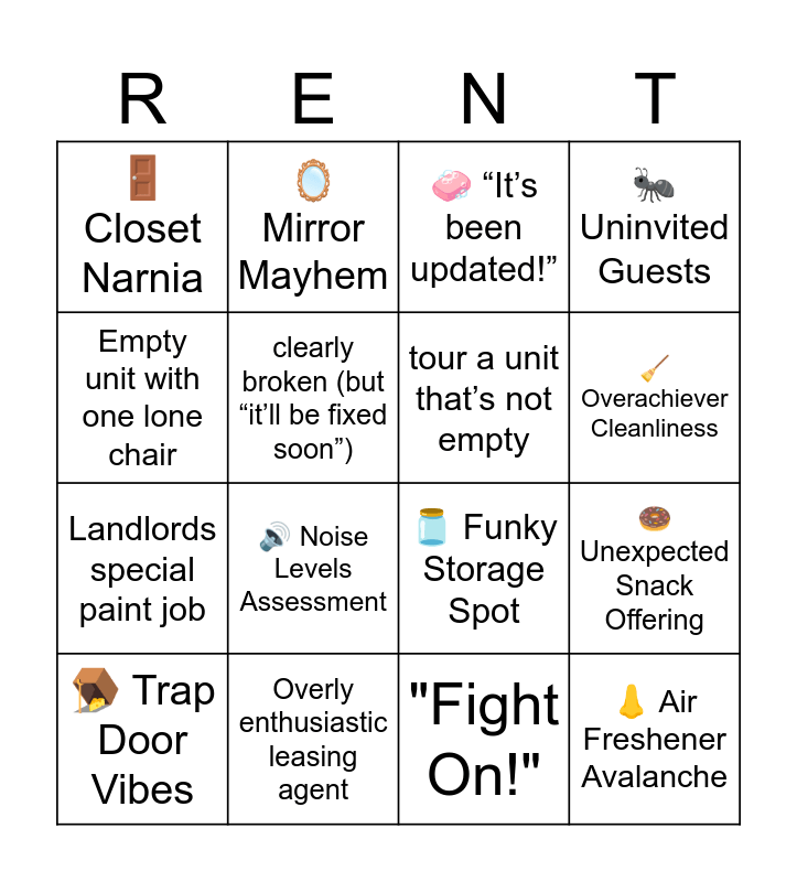 This bingo card has 16 words: Overly enthusiastic leasing agent, 🍩 Unexpected Snack Offering, 🧼 “It’s been updated!”, 🚪 Closet Narnia, Landlords special paint job, 🪞 Mirror Mayhem, 🫙 Funky Storage Spot, "Fight On!", Empty unit with one lone chair, clearly broken (but “it’ll be fixed soon”), 🪤 Trap Door Vibes, 🐜 Uninvited Guests, 🔊 Noise Levels Assessment, 🧹 Overachiever Cleanliness, tour a unit that’s not empty and 👃 Air Freshener Avalanche.