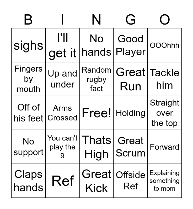 This bingo card has a free space and 24 words: You can't play the 9, Ref, Random rugby fact, Claps hands, OOOhhh, sighs, Fingers by mouth, I'll get it, Holding, Thats High, Great Run, Off of his feet, Great Scrum, Forward, Up and under, Offside Ref, Straight over the top, No hands, Tackle him, Arms Crossed, Explaining something to mom, No support, Good Player and Great Kick.