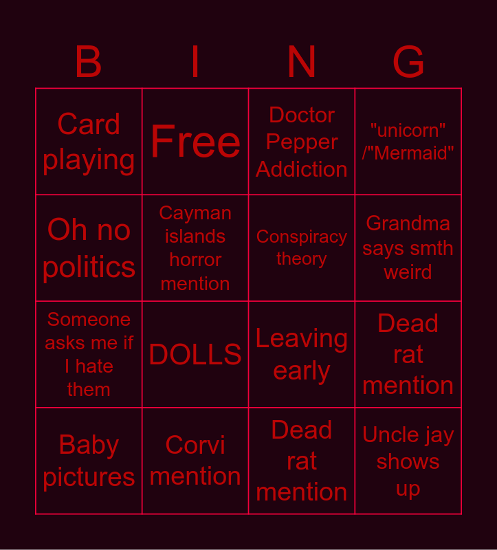 This bingo card has 16 words: Corvi mention, Dead rat mention, Doctor Pepper Addiction, Card playing, Someone asks me if I hate them, Free, Leaving early, Dead rat mention, Oh no politics, Cayman islands horror mention, Baby pictures, "unicorn" /"Mermaid", DOLLS, Grandma says smth weird, Conspiracy theory and Uncle jay shows up.