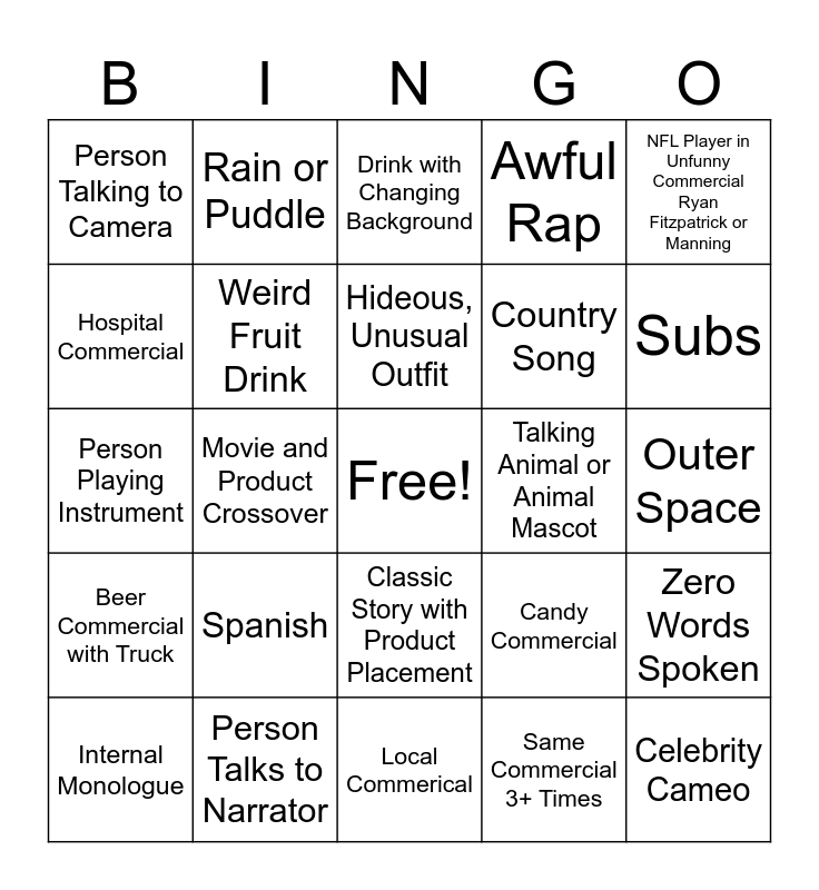 This bingo card has a free space and 32 words: Same Commercial 3+ Times, Obscure R-Rated Trailer, Movie and Product Crossover, Car Commercial that Works Without Car, Beer Commercial with Truck, Weird Fruit Drink, NFL Player in Unfunny Commercial Ryan Fitzpatrick or Manning, Zero Words Spoken, Rain or Puddle, Fine Print Spoken Out Loud, Hideous, Unusual Outfit, Drink with Changing Background, Wings, Animated Commercial, Talking Animal or Animal Mascot, Jewelry Commercial, Internal Monologue, Person Playing Instrument, Classic Story with Product Placement, Spanish, Candy Commercial, Person Closing Eyes While Eating, Outer Space, Person Talks to Narrator, Celebrity Cameo, Awful Rap, Country Song, Hospital Commercial, Person Talking to Camera, Local Commerical, Food Delivery Service and Subs.