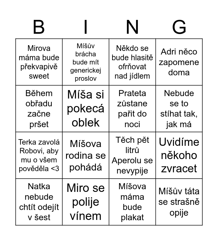 This bingo card has 16 words: Miro se polije vínem, Uvidíme někoho zvracet, Někdo se bude hlasitě ofrňovat nad jídlem, Mirova máma bude překvapivě sweet, Terka zavolá Robovi, aby mu o všem pověděla <3, Míšův brácha bude mít generickej proslov, Těch pět litrů Aperolu se nevypije, Míšova máma bude plakat, Během obřadu začne pršet, Míša si pokecá oblek, Natka nebude chtít odejít v šest, Adri něco zapomene doma, Míšova rodina se pohádá, Nebude se to stíhat tak, jak má, Prateta zůstane pařit do noci and Míšův táta se strašně opije.