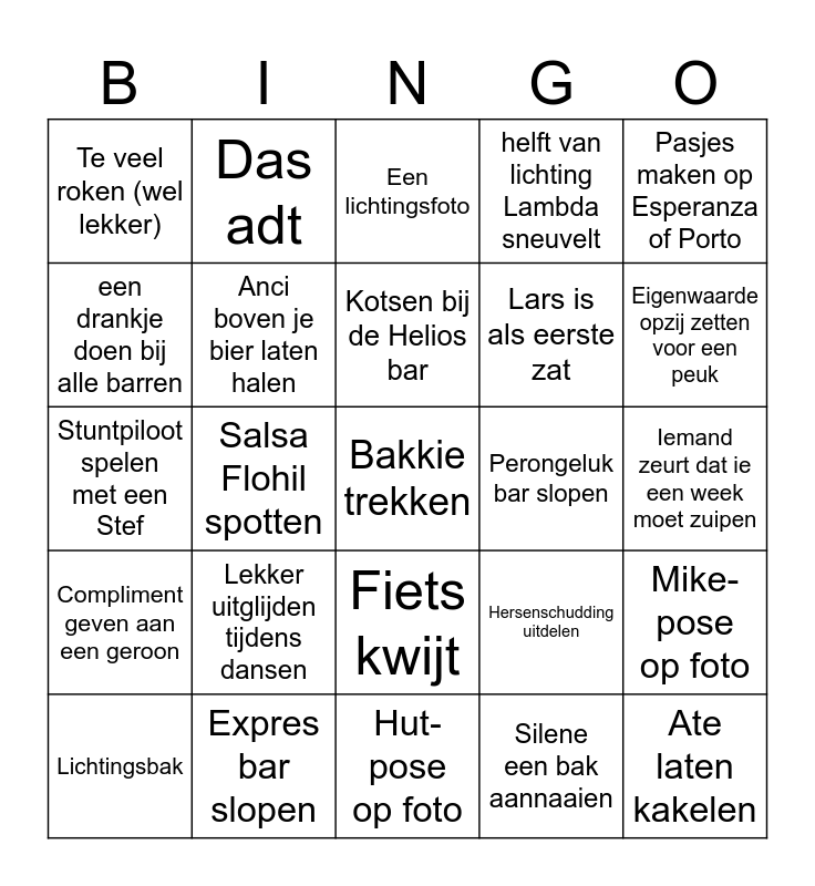 This bingo card has a free space and 24 words: Lichtingsbak, Lekker uitglijden tijdens dansen, Kotsen bij de Helios bar, Silene een bak aannaaien, Pasjes maken op Esperanza of Porto, Te veel roken (wel lekker), Das adt, Een lichtingsfoto, Perongeluk bar slopen, Iemand zeurt dat ie een week moet zuipen, Stuntpiloot spelen met een Stef, Anci boven je bier laten halen, Hersenschudding uitdelen, Mike-pose op foto, een drankje doen bij alle barren, Expres bar slopen, Hut-pose op foto, helft van lichting Lambda sneuvelt, Eigenwaarde opzij zetten voor een peuk, Compliment geven aan een geroon, Salsa Flohil spotten, Fiets kwijt, Lars is als eerste zat and Ate laten kakelen.