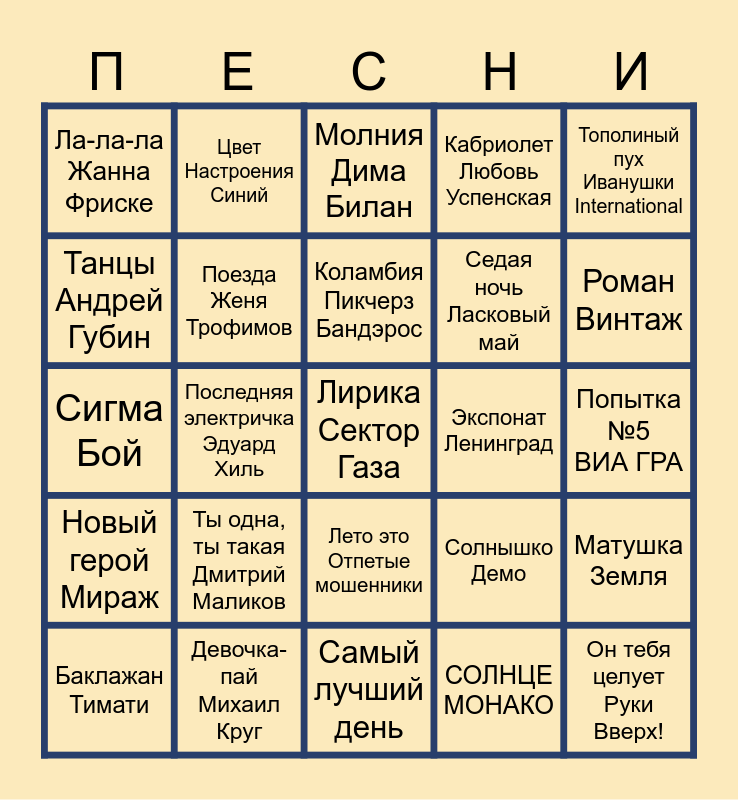 This bingo card has a free space and 28 words: Матушка Земля, Царица, Седая ночь Ласковый май, СОЛНЦЕ МОНАКО, Танцы Андрей Губин, Молния Дима Билан, Цвет Настроения Синий, Новый герой Мираж, Экспонат Ленинград, Баклажан Тимати, Сигма Бой, Кабриолет Любовь Успенская, Девочка-пай Михаил Круг, Самый лучший день, Роман Винтаж, Хоп Хэй Лала Лэй Леонид Агутин, Ты одна, ты такая Дмитрий Маликов, Поезда Женя Трофимов, Коламбия Пикчерз Бандэрос, Лето это Отпетые мошенники, Ла-ла-ла Жанна Фриске, Муси-пуси Катя Лель, Он тебя целует Руки Вверх!, Последняя электричка Эдуард Хиль, Попытка №5 ВИА ГРА, Солнышко Демо, Тополиный пух Иванушки International and Мой ненаглядный Татьяна Буланова.