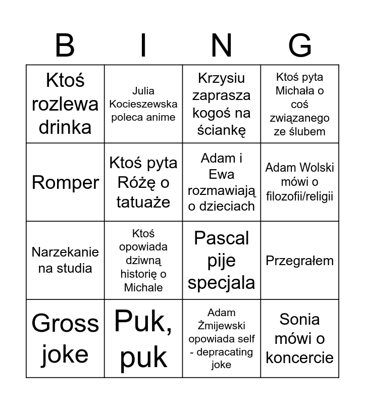 This bingo card has 16 words: Puk, puk, Przegrałem, Krzysiu zaprasza kogoś na ściankę, Ktoś rozlewa drinka, Narzekanie na studia, Julia Kocieszewska poleca anime, Pascal pije specjala, Adam Żmijewski opowiada self - depracating joke, Romper, Ktoś pyta Różę o tatuaże, Gross joke, Ktoś pyta Michała o coś związanego ze ślubem, Ktoś opowiada dziwną historię o Michale, Adam Wolski mówi o filozofii/religii, Adam i Ewa rozmawiają o dzieciach and Sonia mówi o koncercie.