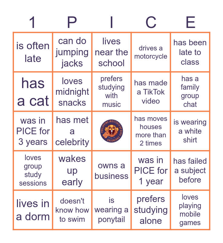 This bingo card has a free space and 59 words: loves thrifting, doesn't know how to swim, knows how to swim well, loves group study sessions, prefers studying alone, loves rainy days, loves midnight snacks, has a dump account, has made a TikTok video, can fall asleep anywhere, drives a motorcycle, has a brother, has a cat, has a sister, has more than 2 siblings, is often late, loves playing mobile games, has been late to class, has submitted something late, prefers studying with music, has moves houses more than 2 times, lives near the school, lives in a dorm, has failed a subject before, is a coffee addict, is currently single, has never ridden an airplane, has multiple piercings, has a family group chat, has had bangs before, was in PICE for 2 years, grew up in the province, has tried cutting their own hair, has helped tutor someone, can do jumping jacks, has a family abroad, is the youngest in the family, has met a celebrity, loves to draw or paint, was in PICE for 3 years, has brown eyes, wakes up early, is wearing a white shirt, is wearing a black shirt, plays a musical instrument, has fallen asleep during a commute, has a favorite OPM artist, grew up in the same house their whole life, owns a business, is wearing a ponytail, speaks another language, has a dog, is new in PICE, loves spicy food, has tried hiking, was in PICE for 1 year, knows how to sew or crochet, has hosted an event and is in a relationship.
