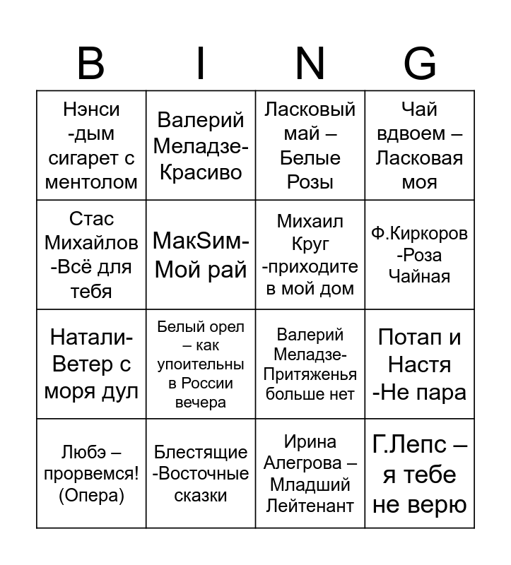 This bingo card has 36 words: Любэ – березы, Ласковый май -Седая ночь, НЕ ПАРА -плачь и смотри, Михаил Круг -приходите в мой дом, Н.Басков – ты далеко, Г.Лепс – я тебе не верю, Ф.Киркоров -Роза Чайная, Игорь Николаев -Дельфин и Русалка, Стас Михайлов -Всё для тебя, Н.Кадышева – Широка река, Потап и Настя -Не пара, Чай вдвоем – Ласковая моя, С.Зверев – Больше гламура, Блестящие -Восточные сказки, Белый орел – как упоительны в России вечера, Нэнси -дым сигарет с ментолом, Г.Лепс -Натали, Ах, какая женщина, Любэ – прорвемся! (Опера), Ласковый май – Белые Розы, Ирина Алегрова – Младший Лейтенант, Юрий Шатунов -Детство, Лепс, Стас Пьеха- Она не твоя, Натали- О, Боже, какой мужчина!, Женщина, я не танцую, Валерий Меладзе- Красиво, Валерий Меладзе- Притяженья больше нет, 25-й этаж – Корни, Натали- Ветер с моря дул, МакSим- Мой рай, Знаешь ли ты- МакSим, Фабрика- Романтика, Про любовь- Фабрика, Пугачева- Позови меня с собой, Тополиный пух- Иванушки International and Билетик в кино- Иванушки International.