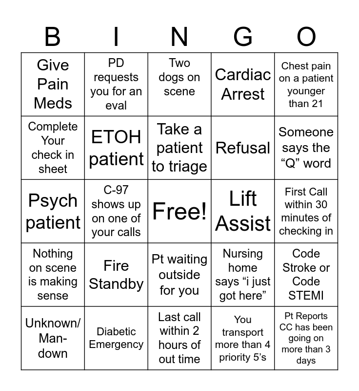 This bingo card has a free space and 24 words: Fire Standby, Diabetic Emergency, Take a patient to triage, Unknown/ Man-down, Chest pain on a patient younger than 21, Give Pain Meds, Complete Your check in sheet, PD requests you for an eval, Lift Assist, Pt waiting outside for you, Refusal, Psych patient, Nursing home says “i just got here”, Code Stroke or Code STEMI, ETOH patient, You transport more than 4 priority 5’s, First Call within 30 minutes of checking in, Two dogs on scene, Someone says the “Q” word, C-97 shows up on one of your calls, Pt Reports CC has been going on more than 3 days, Nothing on scene is making sense, Cardiac Arrest and Last call within 2 hours of out time.