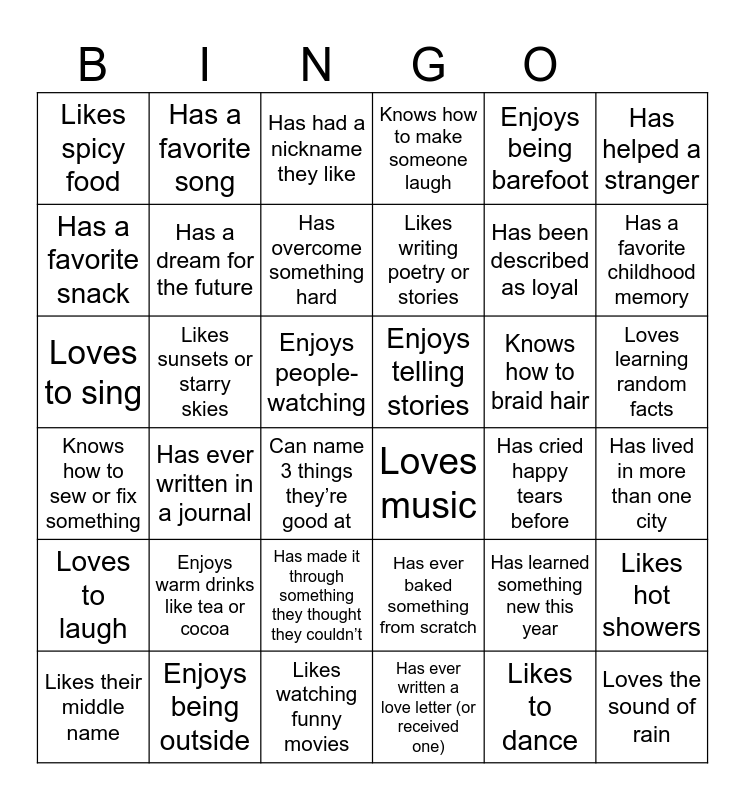 This bingo card has 53 words: Has had a pet, Loves to sing, Can cook a full meal, Has lived in more than one city, Knows how to braid hair, Likes to dance, Has a favorite song, Woke up before 8am today, Has helped a stranger, Loves the sound of rain, Has a favorite snack, Likes watching funny movies, Has ever written in a journal, Knows how to sew or fix something, Likes to color or draw, Can name 3 things they’re good at, Has a dream for the future, Likes sunsets or starry skies, Free!, Enjoys being barefoot, Has a favorite childhood memory, Loves to laugh, Has overcome something hard, Likes spicy food, Has ever given someone good advice, Loves music, Has learned something new this year, Can whistle, Has ever baked something from scratch, Likes writing poetry or stories, Has ever stood up for someone, Enjoys being outside, Has a favorite color, Likes to take naps, Has ever written a love letter (or received one), Likes hot showers, Knows how to make someone laugh, Has cried happy tears before, Has had a nickname they like, Likes iced coffee or tea, Enjoys being creative, Has tried a food from another culture, Enjoys people-watching, Enjoys organizing things, Has helped someone move, Loves learning random facts, Has made it through something they thought they couldn’t, Likes their middle name, Has been described as loyal, Enjoys telling stories, Has surprised someone in a good way, Enjoys warm drinks like tea or cocoa and Can do a good impression of someone.
