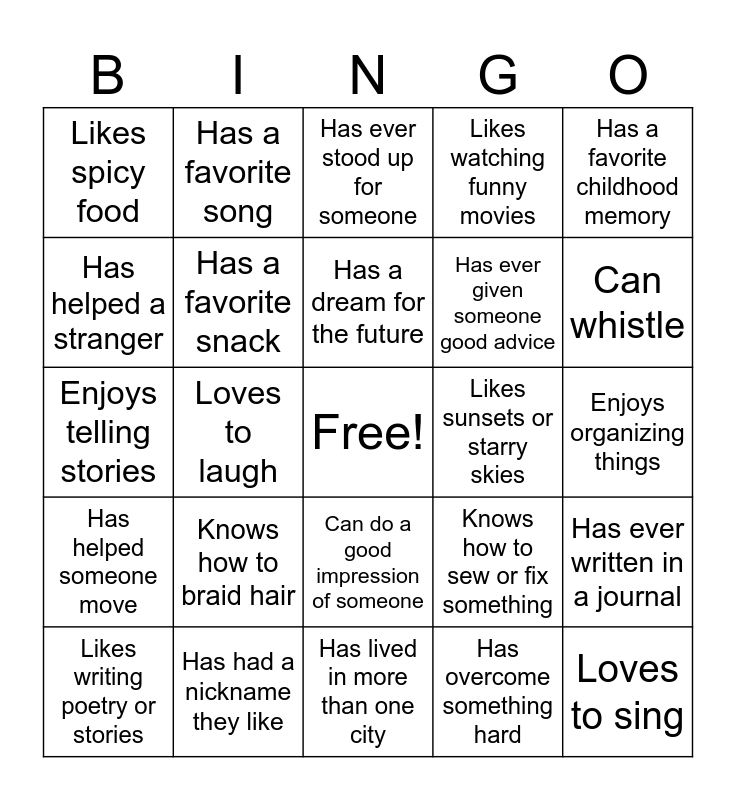 This bingo card has a free space and 51 words: Has had a pet, Loves to sing, Can cook a full meal, Has lived in more than one city, Knows how to braid hair, Likes to dance, Has a favorite song, Woke up before 8am today, Has helped a stranger, Loves the sound of rain, Has a favorite snack, Likes watching funny movies, Has ever written in a journal, Knows how to sew or fix something, Likes to color or draw, Can name 3 things they’re good at, Has a dream for the future, Likes sunsets or starry skies, Enjoys being barefoot, Has a favorite childhood memory, Loves to laugh, Has overcome something hard, Likes spicy food, Has ever given someone good advice, Loves music, Has learned something new this year, Can whistle, Has ever baked something from scratch, Likes writing poetry or stories, Has ever stood up for someone, Enjoys being outside, Likes to take naps, Likes hot showers, Knows how to make someone laugh, Has cried happy tears before, Has had a nickname they like, Likes iced coffee or tea, Enjoys being creative, Has tried a food from another culture, Enjoys people-watching, Enjoys organizing things, Has helped someone move, Loves learning random facts, Has made it through something they thought they couldn’t, Likes their middle name, Has been described as loyal, Enjoys telling stories, Has surprised someone in a good way, Enjoys warm drinks like tea or cocoa, Can do a good impression of someone and Has a favorite color.