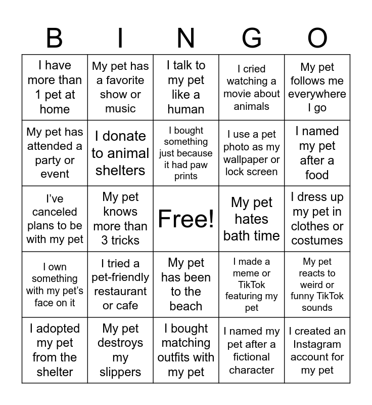 This bingo card has a free space and 29 words: I adopted my pet from the shelter, I celebrate my pet’s birthday, My pet knows more than 3 tricks, My pet sleeps beside me, I have more than 1 pet at home, I talk to my pet like a human, I donate to animal shelters, I tried a pet-friendly restaurant or cafe, My pet hates bath time, My pet destroys my slippers, I dress up my pet in clothes or costumes, I created an Instagram account for my pet, I bought matching outfits with my pet, I named my pet after a fictional character, I named my pet after a food, My pet once ran away (and came back), My pet has been to the beach, I own something with my pet’s face on it, My pet follows me everywhere I go, I’ve canceled plans to be with my pet, I made a meme or TikTok featuring my pet, I’ve saved more pet videos than human videos, I use a pet photo as my wallpaper or lock screen, My pet has attended a party or event, I cried watching a movie about animals, My pet has a favorite show or music, My pet reacts to weird or funny TikTok sounds, I bought something just because it had paw prints and My pet “talks back” or mimics sounds.