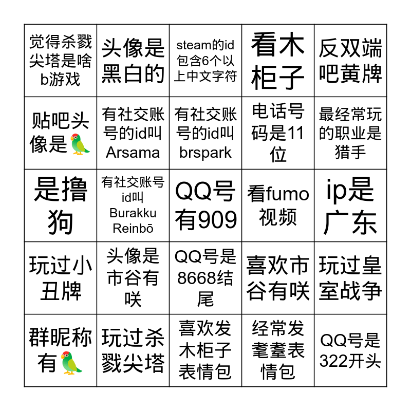 This bingo card has a free space and 24 words: 头像是市谷有咲, 玩过杀戮尖塔, 有社交账号的id叫brspark, 群昵称有🦜, 反双端吧黄牌, 觉得杀戮尖塔是啥b游戏, 贴吧头像是🦜, 头像是黑白的, 看fumo视频, QQ号是8668结尾, 电话号码是11位, 是撸狗, 喜欢市谷有咲, 玩过皇室战争, 有社交账号的id叫Arsama, 经常发耄耋表情包, ip是广东, steam的id包含6个以上中文字符, 最经常玩的职业是猎手, 有社交账号id叫Burakku Reinbō, QQ号是322开头, 玩过小丑牌, 看木柜子 and 喜欢发木柜子表情包.