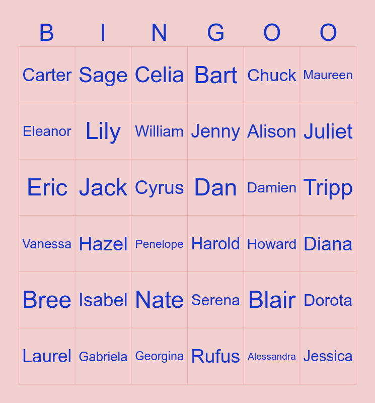 This bingo card has 36 words: Serena, Nate, Rufus, Eleanor, Vanessa, Dan, Lily, Georgina, Chuck, Blair, Juliet, Bart, Dorota, Jack, Jenny, Carter, Bree, Damien, Eric, Celia, Cyrus, Hazel, Harold, Penelope, Howard, Sage, Alison, Gabriela, William, Maureen, Jessica, Laurel, Diana, Tripp, Isabel and Alessandra.