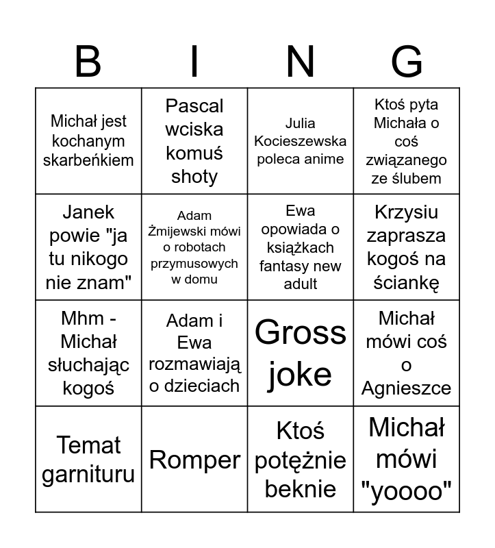 This bingo card has 27 words: Puk, puk, Przegrałem, Mhm - Michał słuchając kogoś, Ktoś rozlewa drinka, Adam Żmijewski mówi o robotach przymusowych w domu, Julia Kocieszewska poleca anime, Pascal wciska komuś shoty, Michał mówi "yoooo", Romper, Ktoś pyta Różę o tatuaże, Gross joke, Ktoś pyta Michała o coś związanego ze ślubem, Ktoś opowiada dziwną historię o Michale, Adam Wolski mówi o filozofii/religii, Adam i Ewa rozmawiają o dzieciach, Sonia mówi o koncercie, Ewa opowiada o książkach fantasy new adult, Krzysiu zaprasza kogoś na ściankę, Michał mówi o wyższości Pf2 nad D&D, Michał jest kochanym skarbeńkiem, Ktoś potężnie beknie, Temat rpg, Michał mówi coś o Agnieszce, Temat garnituru, Narzekanie na studia, Janek powie "ja tu nikogo nie znam" and Wolność.