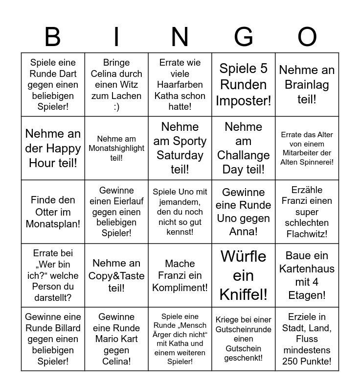 This bingo card has a free space and 24 words: Nehme an Copy&Taste teil!, Gewinne eine Runde Mario Kart gegen Celina!, Nehme am Sporty Saturday teil!, Gewinne eine Runde Billard gegen einen beliebigen Spieler!, Nehme an Brainlag teil!, Spiele eine Runde Dart gegen einen beliebigen Spieler!, Nehme an der Happy Hour teil!, Bringe Celina durch einen Witz zum Lachen :), Gewinne eine Runde Uno gegen Anna!, Mache Franzi ein Kompliment!, Nehme am Challange Day teil!, Finde den Otter im Monatsplan!, Würfle ein Kniffel!, Baue ein Kartenhaus mit 4 Etagen!, Nehme am Monatshighlight teil!, Kriege bei einer Gutscheinrunde einen Gutschein geschenkt!, Erzähle Franzi einen super schlechten Flachwitz!, Errate wie viele Haarfarben Katha schon hatte!, Errate das Alter von einem Mitarbeiter der Alten Spinnerei!, Gewinne einen Eierlauf gegen einen beliebigen Spieler!, Erziele in Stadt, Land, Fluss mindestens 250 Punkte!, Errate bei „Wer bin ich?“ welche Person du darstellt?, Spiele 5 Runden Imposter! and Spiele eine Runde „Mensch Ärger dich nicht“ mit Katha und einem weiteren Spieler!.