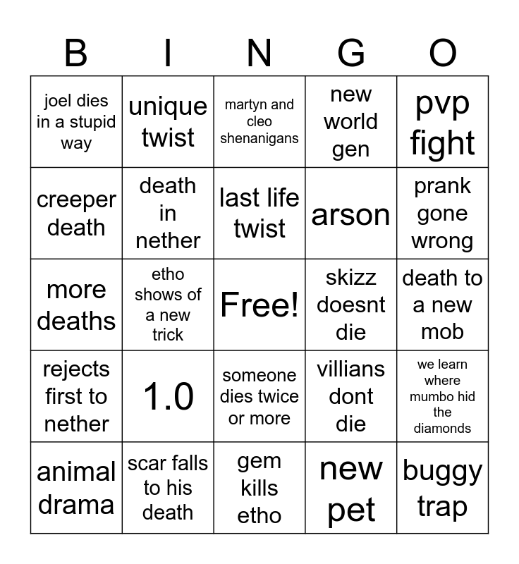 This bingo card has a free space and 24 words: 1.0, scar falls to his death, last life twist, animal drama, pvp fight, joel dies in a stupid way, creeper death, unique twist, skizz doesnt die, someone dies twice or more, arson, more deaths, villians dont die, we learn where mumbo hid the diamonds, death in nether, new pet, death to a new mob, martyn and cleo shenanigans, prank gone wrong, etho shows of a new trick, buggy trap, rejects first to nether, new world gen and gem kills etho.