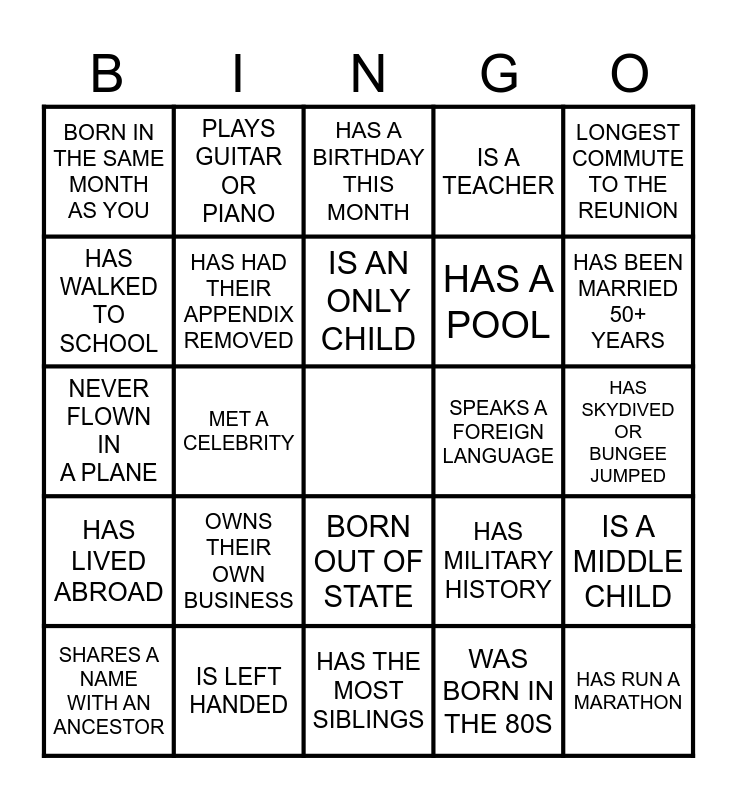 This bingo card has a free space and 24 words: OWNS THEIR OWN BUSINESS, IS LEFT HANDED, IS AN ONLY CHILD, SHARES A NAME WITH AN ANCESTOR, LONGEST COMMUTE TO THE REUNION, BORN IN THE SAME MONTH AS YOU, HAS WALKED TO SCHOOL, PLAYS GUITAR OR PIANO, SPEAKS A FOREIGN LANGUAGE, BORN OUT OF STATE, HAS A POOL, NEVER FLOWN IN A PLANE, HAS MILITARY HISTORY, IS A MIDDLE CHILD, HAS HAD THEIR APPENDIX REMOVED, WAS BORN IN THE 80S, HAS SKYDIVED OR BUNGEE JUMPED, HAS A BIRTHDAY THIS MONTH, HAS BEEN MARRIED 50+ YEARS, MET A CELEBRITY, HAS RUN A MARATHON, HAS LIVED ABROAD, IS A TEACHER and HAS THE MOST SIBLINGS.