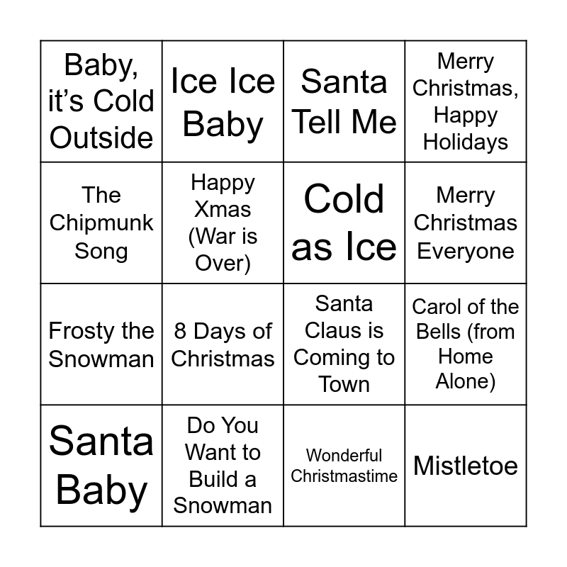 This bingo card has 20 words: Carol of the Bells (from Home Alone), Driving Home for Christmas, Santa Tell Me, Winter Wonderland, Santa Baby, The Chipmunk Song, Do You Want to Build a Snowman, Baby, it’s Cold Outside, Frosty the Snowman, Ice Ice Baby, 8 Days of Christmas, Santa Claus is Coming to Town, Happy Xmas (War is Over), Mistletoe, Cold as Ice, Silver Bells, Merry Christmas Everyone, Merry Christmas, Happy Holidays, Wonderful Christmastime and White Christmas.