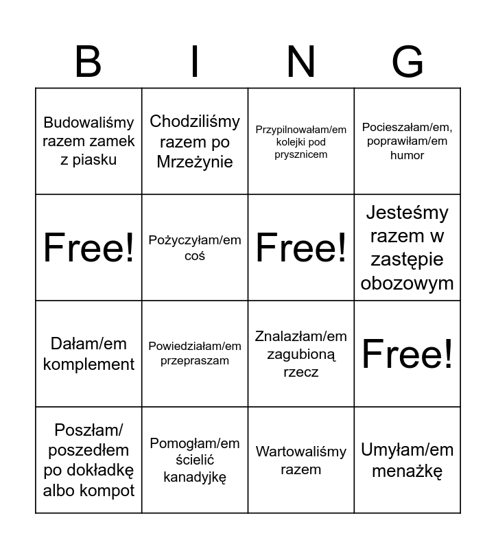 This bingo card has 16 words: Pomogłam/em ścielić kanadyjkę, Free!, Przypilnowałam/em kolejki pod prysznicem, Budowaliśmy razem zamek z piasku, Dałam/em komplement, Chodziliśmy razem po Mrzeżynie, Znalazłam/em zagubioną rzecz, Wartowaliśmy razem, Free!, Pożyczyłam/em coś, Poszłam/ poszedłem po dokładkę albo kompot, Pocieszałam/em, poprawiłam/em humor, Powiedziałam/em przepraszam, Jesteśmy razem w zastępie obozowym, Free! and Umyłam/em menażkę.