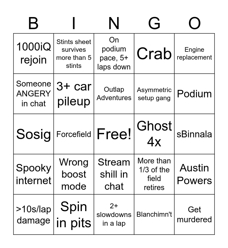 This bingo card has a free space and 57 words: <1k iR guy, >10s/lap damage, 0x stint, 1000iQ rejoin, 2+ slowdowns in a lap, 3 wide, 3+ car pileup, 5+ cars die on lap 1, Asymmetric setup gang, Carnage in turn 1, Crab, Cursed livery, Die after leading, DNF, Do a 0x stint, Down 10kph, Engine replacement, Forcefield, Forgot to brake, Get murdered, Ghost 4x, Lapped car blocking, More than 1/3 of the field retires, On podium pace, 5+ laps down, Only one car on lead lap, Outlap Adventures, Penalty (incident points), Pit strategy overtake, Podium, Porsche curves walltap, Punt somebody, R class driver, Ran out of fuel, Reverse Entry, sBinnala, Someone ANGERY in chat, Someone goes to space, Sosig, Speeding in pits, Spooky internet, Stints sheet survives more than 5 stints, Stream shill in chat, Surprise hug, Survive lap 1, Technical Difficulties, Unintentional Dorifto, Wrong boost mode, Spin in pits, Penalty (protest), Wrong Tyres, Accidental fast repair, Blanchimn't, Raspinnillion, More Combes, Lawnmovertake, Austin Powers and S-pit.