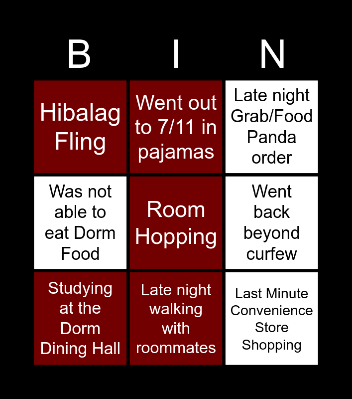 This bingo card has 9 words: Studying at the Dorm Dining Hall, Late night Grab/Food Panda order, Went out to 7/11 in pajamas, Was not able to eat Dorm Food, Hibalag Fling, Went back beyond curfew, Room Hopping, Last Minute Convenience Store Shopping and Late night walking with roommates.